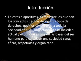 Este documento presenta una introducción a los conceptos básicos de las normas de conducta, incluyendo normas jurídicas, morales, religiosas y de trato social. Explica que las normas de conducta limitan y guían el comportamiento en una sociedad y clasifica los diferentes tipos de normas.