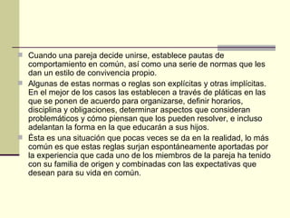 El documento describe cuatro estilos familiares determinados por la forma en que se aplican las normas de convivencia: familias rígidas, con normas autoritarias e inflexibles; familias laxas, con mínimas normas y poca disciplina; familias flexibles, capaces de aplicar normas de forma discriminada según la edad y situación; y familias caóticas, con normas que fluctúan sin orden ni fundamentación. Señala que el mejor ambiente para los niños es el de la familia flexible, que permite orden predecible pero también expresión y comunic