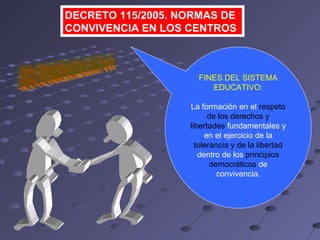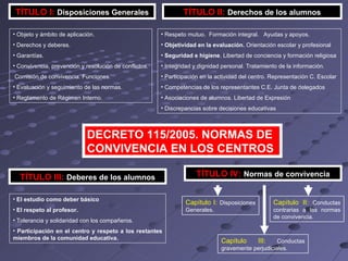 Este documento establece las normas de convivencia en los centros educativos. Define los derechos y deberes de los alumnos, así como las conductas contrarias a las normas y las medidas correctoras aplicables. Se especifican cuatro títulos que tratan sobre disposiciones generales, derechos de los alumnos, deberes de los alumnos y normas de convivencia, incluyendo conductas contrarias leves y graves y los procedimientos y sanciones correspondientes.