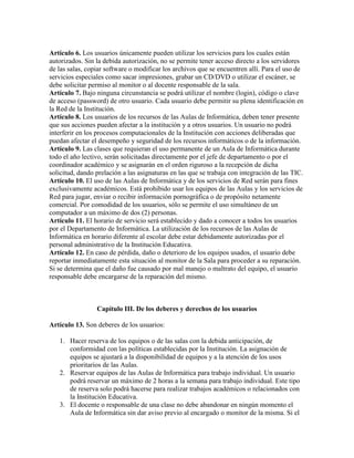 Este documento establece el reglamento de usuarios de las aulas de informática de una institución educativa. Define los tipos de usuarios, sus deberes y derechos, y las normas para el uso de los recursos tecnológicos. También especifica las causales de sanción por incumplimiento de las normas y el procedimiento para aplicarlas. El objetivo es regular el uso adecuado de las aulas de informática con fines académicos.