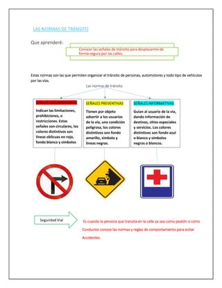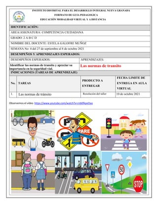 Este documento presenta una guía pedagógica para la asignatura de Competencia Ciudadana para el grado 2. La guía incluye desempeños y aprendizajes esperados relacionados con las normas de tránsito y la seguridad vial. Explica las diferentes clases de señales de tránsito y sus significados, e incluye normas para peatones, ciclistas y conductores. Contiene actividades para que los estudiantes identifiquen el significado de las señales y demuestren su conocimiento de las normas de