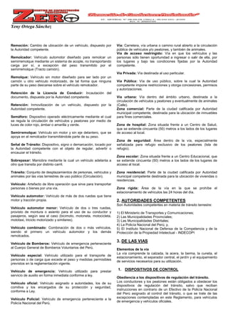El documento define más de 100 términos relacionados con normas de tránsito según el Reglamento Nacional de Tránsito del Perú. Entre los términos definidos se encuentran tipos de vehículos, infracciones, señales de tránsito, autoridades competentes y elementos de la vía como calzada, acera y berma. Además, describe las formas y significados de las señales y luces de los semáforos para regular la circulación de vehículos y peatones.