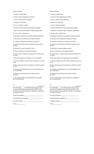 El documento presenta las normas que los estudiantes deben seguir en el salón de clases, incluyendo llegar a tiempo, usar el uniforme completo, mantener los materiales limpios y organizados, respetar a los compañeros y maestros, y comprometerse a cumplir las reglas durante el año escolar.