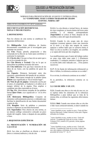 Este documento presenta las normas para la presentación de avances y entrega final de trabajos de grado del Colegio La Presentación de Duitama. Describe los requisitos de formato como márgenes, espacios interlineales y numeración de páginas. También especifica los elementos que deben incluirse en la portada y cubierta como el título del trabajo, nombre del autor, institución y año. Por último, indica que los avances deben enviarse exclusivamente al correo colpreinvestiga@gmail.com siguiendo estos parámetros de presentación.