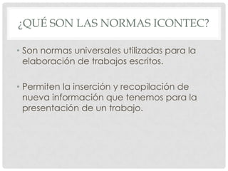 Las normas ICONTEC son normas universales utilizadas para la elaboración de trabajos escritos. Establecen características del papel como tamaño carta o A4 y escribir por una sola cara, así como dimensiones de las márgenes. Los trabajos escritos según estas normas incluyen introducción, capítulos, conclusiones y bibliografía.