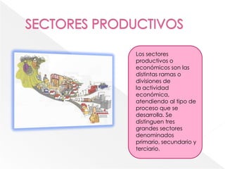 El documento describe los cuatro sectores económicos: primario, secundario, terciario y cuaternario. El sector primario incluye actividades como la agricultura, ganadería y pesca que transforman recursos naturales. El sector secundario transforma los productos primarios en nuevos productos a través de la industria y manufactura. El sector terciario ofrece una amplia gama de servicios a personas y empresas. El sector cuaternario involucra actividades relacionadas con la información como investigación e innovación.