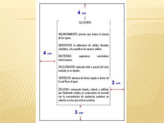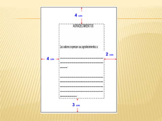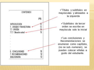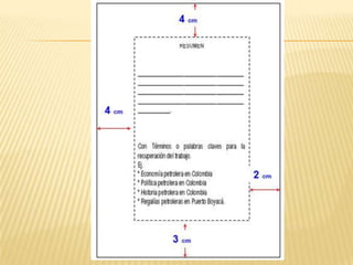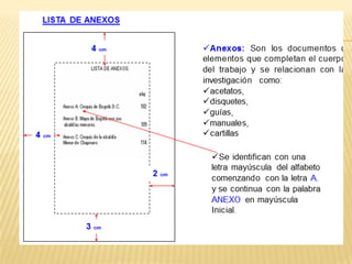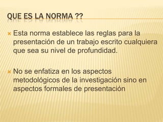Este documento presenta las normas para la presentación de trabajos escritos establecidas en la Norma Técnica Colombiana 1486. Explica que la norma establece reglas formales para la presentación de cualquier trabajo escrito sin importar su nivel de profundidad. Detalla los componentes que debe contener un proyecto como el título, objetivos, marco teórico, diseño metodológico, y cronograma. Además, explica cómo deben organizarse elementos como la portada, índice, resumen, bibliografía, anexos