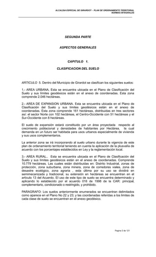 Este documento presenta las normas integrales del Plan de Ordenamiento Territorial del municipio de Girardot, Colombia. Establece la clasificación del suelo en áreas urbana, de expansión urbana y rural. Divide políticamente el municipio en cinco comunas y dos corregimientos rurales. Define el sistema de nomenclatura para identificar vías, predios y construcciones en la malla urbana y rural.