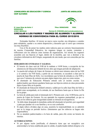 Este documento presenta las normas y horarios para el curso escolar 2015/2016 en el CEIP Alfares. Contiene información sobre los horarios de entrada y salida, autorizaciones para recoger alumnos temprano, asistencia regular, comunicación con los padres, cuidado de libros de texto, medidas de salud e higiene, y horarios para reunirse con maestros, el director y otros miembros del personal. Se pide a los padres que firmen un recibo mostrando que han recibido y aceptado estas normas para el nuevo curso escolar.