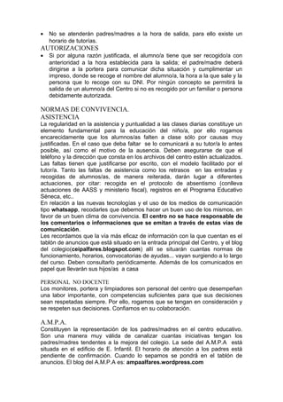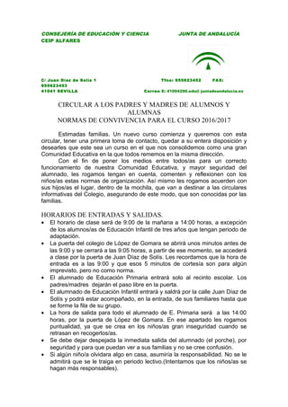 El documento es una circular dirigida a los padres y madres de alumnos del CEIP Alfares con normas de convivencia para el curso escolar 2016/2017. Presenta horarios de entrada y salida, normas sobre asistencia y autorizaciones, normas de convivencia, y horarios de atención a padres. Solicita a los padres firmar un recibí indicando que han sido informados de las normas.