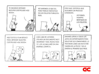 El documento proporciona información sobre varias normas ISO relacionadas con la gestión de calidad, incluyendo ISO 10002, 10014 y 10005. Explica los objetivos y estructura de cada norma, así como herramientas y métodos recomendados para la implementación de los principios de gestión de calidad. También incluye procesos de autoevaluación para medir el nivel de madurez y priorizar áreas de mejora.