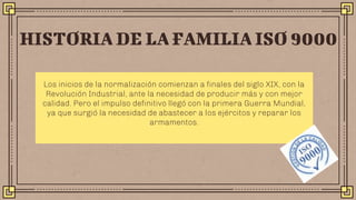 La familia de normas ISO 9000 incluye normas para sistemas de gestión de calidad. La ISO 9000 describe los fundamentos y terminología, la ISO 9001 especifica los requisitos de los sistemas de gestión de calidad, y la ISO 9004 proporciona directrices para mejorar la eficacia y eficiencia. Otras normas como la ISO 19011 brindan orientación para auditorías de calidad. El documento analiza la historia y beneficios de las normas ISO 9000 para empresas.