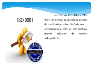Este documento resume las normas ISO 9001 e ISO 9004 sobre sistemas de gestión de calidad. Explica que los procesos clave incluyen la dirección, provisión de recursos, realización del producto, medición, análisis y mejora. También describe la política de calidad de una organización, incluyendo objetivos, compromiso con los requisitos y mejora continua. Finalmente, cubre procesos relacionados con el cliente como atención de pedidos, comunicación e información sobre el producto.
