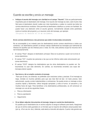 El documento proporciona recomendaciones para escribir y enviar correos electrónicos de manera efectiva y respetuosa, incluyendo especificar un asunto claro, enviarlo solo a personas involucradas, ser breve y claro, revisar antes de enviar, y agregar información de contacto. También recomienda administrar los correos recibidos organizándolos en carpetas y respetar la privacidad de los mensajes.