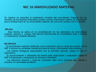 Este documento establece las normas para contabilizar el inmovilizado material. Prescribe que el inmovilizado se contabilice inicialmente por su coste y posteriormente al coste menos amortización acumulada y pérdidas por deterioro, o bien mediante el modelo de revalorización. También especifica cómo se debe amortizar y evaluar el deterioro del valor del inmovilizado material.