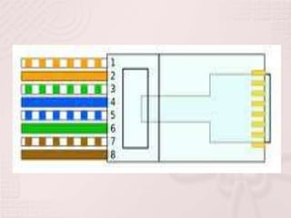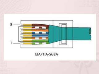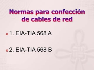 Este documento describe dos normas para el cableado estructurado de redes de computadoras, EIA-TIA 568A y EIA-TIA 568B. Se diferencian en el orden de los colores de los pares de cables RJ45. La norma 568A especifica requisitos para cableado de telecomunicaciones en oficinas como topologías, distancias y parámetros de rendimiento para más de 10 años. La norma 568B sigue el mismo orden de colores pero en los extremos opuestos del cable.