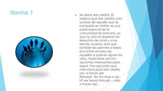 El documento presenta 4 normas para el uso de Twitter: 1) Dar crédito a los autores al compartir contenido, 2) No promocionarse excesivamente, 3) Usar enlaces de manera apropiada para proporcionar más información, y 4) Seguir a usuarios que representen valor e intereses comunes más que a todos los seguidores.