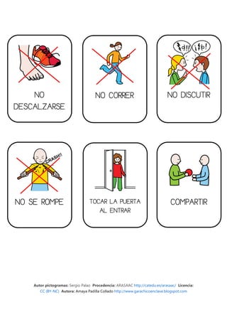 Este documento presenta una serie de pictogramas que representan normas de conducta para el aula y la casa. Se propone recortar y plastificar las tarjetas para usarlas como recordatorios visuales de las normas y para enseñarlas a los estudiantes cuando muestran un comportamiento inadecuado, seguido de mostrar una tarjeta con el comportamiento correcto. El objetivo es que los estudiantes aprendan las normas a través de la constancia y el trabajo durante todo el curso con el apoyo de las familias.