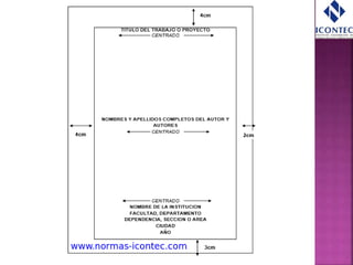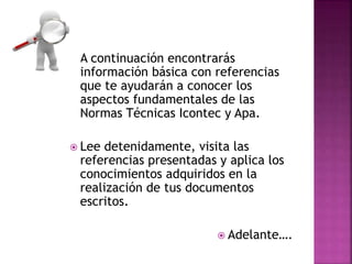 Este documento proporciona información sobre las normas técnicas Icontec y APA para la presentación de documentos escritos. Explica que Icontec establece las normas en Colombia y que tanto Icontec como APA buscan estandarizar la presentación de textos para darles credibilidad y facilitar la lectura. Resume los aspectos clave de cada norma como los márgenes, fuentes, numeración de páginas, citas y referencias. Incluye enlaces para más información.