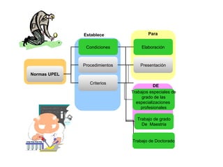 Este documento establece las normas y procedimientos para la elaboración y presentación de trabajos de grado de especialización, maestrías y tesis doctorales en la Universidad Pedagógica Experimental Libertador. Describe los tipos de trabajos de grado, su estructura, formato y estilo de redacción. Entre otros aspectos, especifica que los trabajos deben ser originales, contar con la asesoría de un tutor, y no exceder ciertos límites de páginas según el nivel de grado.