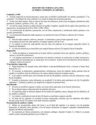 Este documento resume las normas de la Asociación Estadounidense de Psicología (APA) para la Universidad Pedagógica Experimental Libertador (UPEL). Cubre temas como estilo y formato de escritura, márgenes, paginación, presentación de cuadros y gráficos, citas y referencias. Entre otras cosas, especifica que el texto debe escribirse a espacio y medio, los títulos en mayúsculas y negrita, y la lista de referencias debe organizarse alfabéticamente.