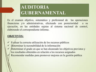 Las Normas de Auditoría Gubernamental (NAGU) establecen los criterios y procedimientos que deben seguirse para realizar auditorías de calidad en el sector público. Las NAGU cubren temas como las calificaciones de los auditores, la planificación de auditorías, la ejecución a través de la revisión del control interno y el cumplimiento legal, y la presentación de informes por escrito de manera oportuna. El objetivo principal de las NAGU es uniformar el trabajo de auditoría gubernamental y obtener resultados de alta cal