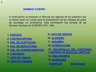 Este documento presenta las normas de presentación para trabajos escritos según las Normas Técnicas de ICONTEC NTC 1486. Describe los 15 elementos principales que debe contener un trabajo escrito como la portada, contraportada, tabla de contenido, bibliografía, y los márgenes requeridos. Además, explica aspectos como la numeración y formato de títulos, listas, y citas bibliográficas.