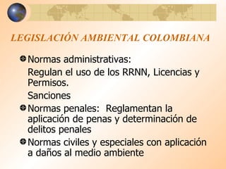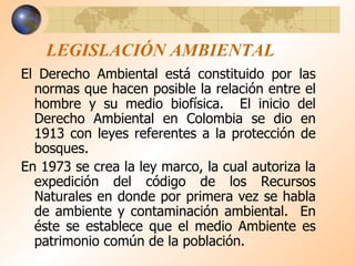 El derecho ambiental en Colombia establece normas para regular la interacción entre el ser humano y su entorno, comenzando en 1913 con leyes para la protección de bosques y culminando con la creación del Ministerio del Medio Ambiente en 1993. El Sistema Nacional Ambiental (SINA) coordina diversas entidades para gestionar recursos naturales y asegurar un desarrollo sostenible, regulando proyectos a través de licencias ambientales que requieren estudios de impacto. Las tarifas por estos servicios son variables según el valor de los proyectos, garantizando la sostenibilidad y protección del medio ambiente.