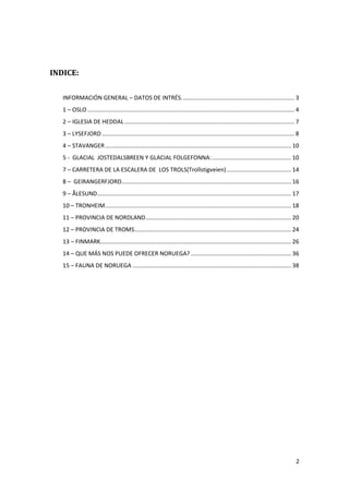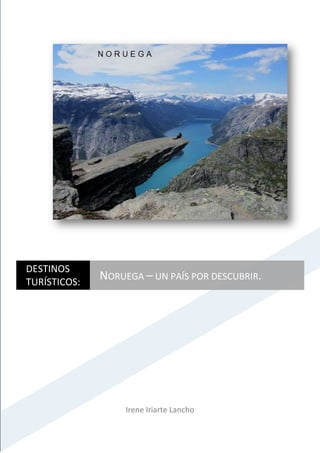 Este documento presenta una ruta turística por Noruega de sur a norte, pasando por sus principales atracciones. Comienza en la capital Oslo y finaliza en Kirkenes, cerca de la frontera con Rusia. Describe lugares como iglesias de madera, fiordos impresionantes, glaciares, pueblos pintorescos y carreteras espectaculares, destacando la belleza natural del país y su rica cultura.