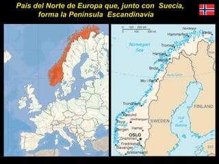 Este documento presenta una guía turística de Noruega, comenzando con una introducción del país y su ubicación en Escandinavia. Luego describe diversos paisajes y atracciones turísticas a lo largo de Noruega, incluyendo ríos, lagos, pueblos pintorescos, iglesias antiguas, senderos para esquiar y senderismo, cascadas impresionantes, y vistas espectaculares de fiordos. Finalmente, concluye la guía con fotos de la capital Oslo y su fiordo.