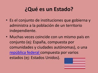 El documento aborda la definición y características de los estados, destacando sus distintas estructuras, como gobiernos democráticos y autoritarios en regiones como América, África y Asia. También se expone la organización política de España, incluyendo su sistema de gobierno y las instituciones que la conforman, como las Cortes Generales y el poder judicial. Finalmente, se menciona la importancia de la lucha por la igualdad social y el papel de diversas organizaciones en la sociedad.