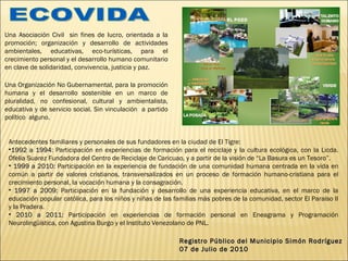 ECOVIDA es un centro sin fines de lucro dedicado a la promoción humana y el desarrollo sostenible a través de actividades ambientales, educativas y ecoturísticas para el crecimiento personal y comunitario basado en valores como la vida, la solidaridad, la justicia y la paz. Sus fundadores tienen experiencia en reciclaje, formación ecológica, educación popular y formación personal. La visión de ECOVIDA es servir como un espacio de referencia para construir un mundo posible mediante el disfrute de valores y la armon