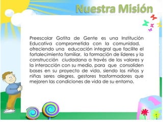 El documento describe la misión y objetivos de la institución educativa preescolar Gotita de Gente. Busca ofrecer una educación integral que fortalezca a las familias, forme líderes y construya ciudadanía a través de valores. Su enfoque es desarrollar las habilidades de los niños para que sean seres alegres y transformadores de su comunidad. La evaluación tiene como fin constatar los aprendizajes de los niños, identificar factores que afectan el aprendizaje y mejorar la acción educativa.