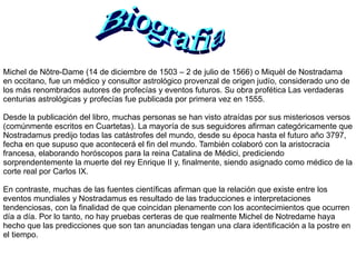 Michel de Nôtre-Dame, mejor conocido como Nostradamus, fue un médico y astrólogo francés del siglo XVI conocido por sus profecías publicadas en 1555 en su obra "Las verdaderas centurias astrológicas y profecías". Aunque muchos creen que predijo eventos futuros, fuentes científicas afirman que las supuestas predicciones son en realidad interpretaciones tendenciosas de sus escritos.