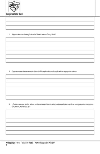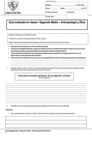 Este documento presenta una guía de trabajo para un curso de Antropología y Ética de segundo medio. La guía incluye instrucciones para completarla en grupos y entregarla, y contiene tres secciones con preguntas sobre la opción fundamental, la diferencia entre ética y moral, y valores cristianos. Los estudiantes deben interpretar una frase sobre decisiones y la vida, y responder preguntas relacionadas con los temas vistos en clase usando una tabla para la autoevaluación de su trabajo.