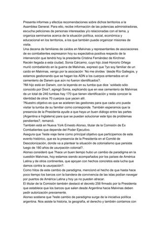 La presidenta argentina Cristina Fernández de Kirchner hablará hoy ante el Comité de Descolonización de las Naciones Unidas sobre las Malvinas, siendo la primera vez que un jefe de estado argentino habla en este foro. La presidenta busca reafirmar la soberanía argentina sobre las islas Malvinas y pedirá avances en la identificación de los soldados argentinos enterrados en el cementerio de Darwin. Familiares de caídos y ex combatientes acompañarán a la presidenta con esperanza de que su discurso ayude a