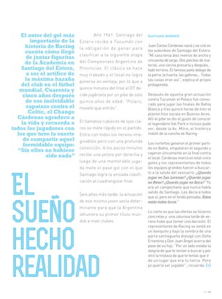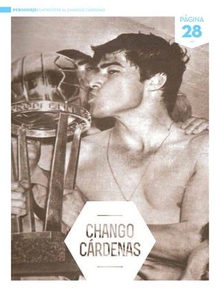 El documento presenta una entrevista al exfutbolista Juan Carlos "Chango" Cárdenas donde cuenta su historia desde sus orígenes humildes en Santiago del Estero hasta su llegada a Racing en 1961. Cárdenas marcó el gol que clasificó a su equipo provincial a la etapa final de un campeonato nacional, lo que llamó la atención de Racing que lo contrató. En su primera práctica con Racing hizo dos goles y enfrentó a Pelé jugando para el Santos, aunque le costó afianzarse como titular al principio.