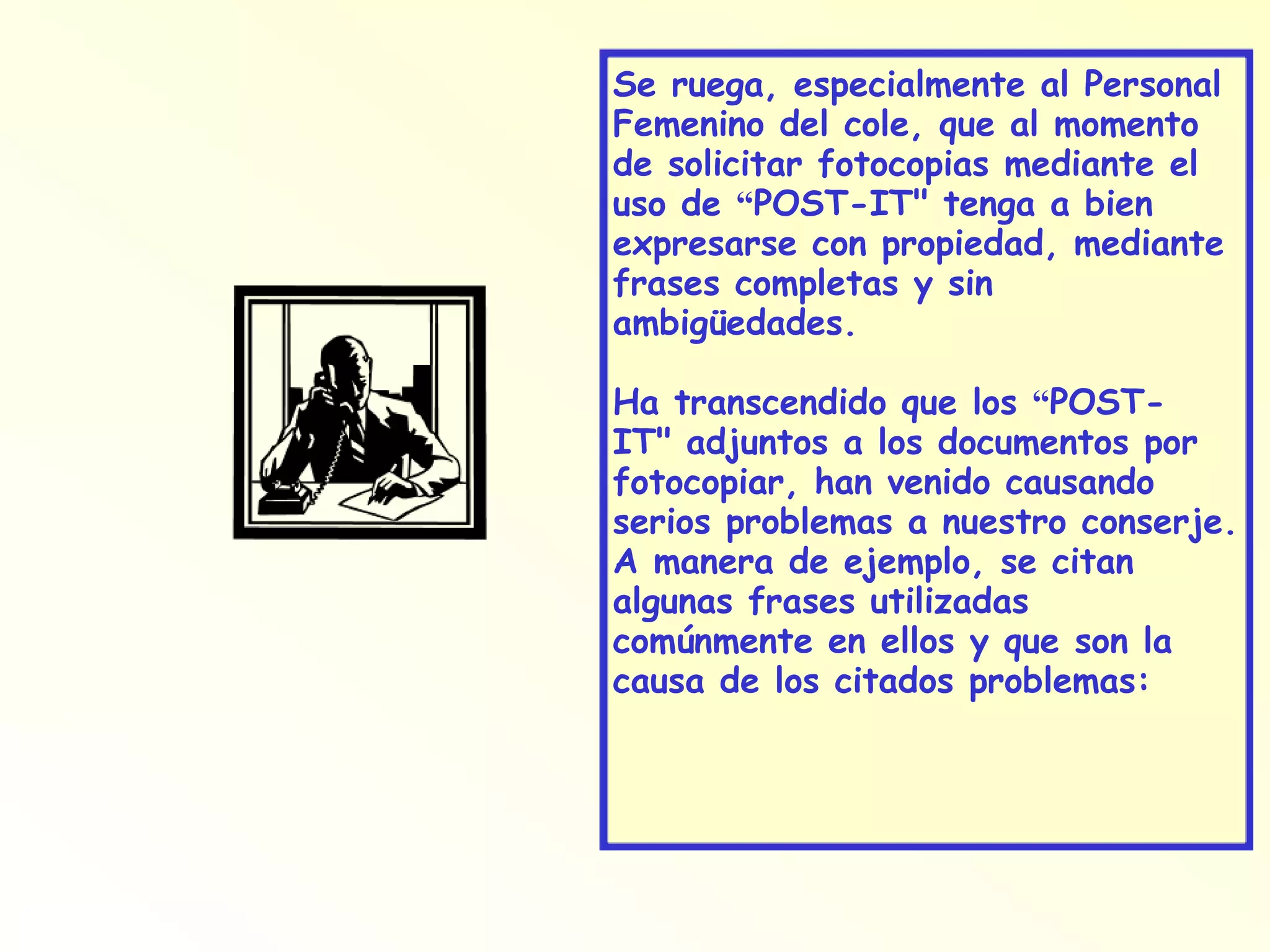 El documento pide al personal femenino usar frases completas y sin ambigüedades al solicitar fotocopias, ya que los mensajes en los "post-it" han causado problemas al conserje Paco. Se citan ejemplos de frases comúnmente usadas que son malentendidas, como "hazme cuatro rapidito" o "¡No te olvides de sacármela toda!". Se pide mayor claridad en los pedidos para evitar futuros malentendidos.