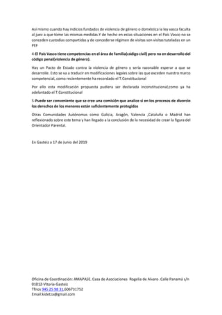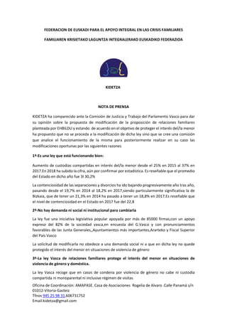 KIDETZA compareció ante la Comisión de Justicia y Trabajo del Parlamento Vasco para opinar sobre la propuesta de modificar la ley de relaciones familiares. KIDETZA propuso no modificar la ley sino crear una comisión que analice su funcionamiento, ya que 1) la ley está funcionando bien y ha aumentado las custodias compartidas, 2) no hay demanda social o institucional para cambiarla, y 3) la ley protege el interés del menor en casos de violencia de género al no permitir la custodia compartida o régimen de