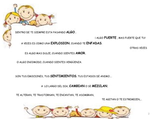 Este documento habla sobre las emociones y sentimientos humanos. Explica que las emociones nos dan energía y nos impulsan a actuar. Algunas emociones como el miedo se aprenden por experiencia directa, mientras que otras se aprenden por observación. El documento también sugiere que es importante que los niños aprendan a identificar y controlar sus emociones con la ayuda de sus familias y maestros.