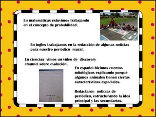 El documento es una carta a las familias de los estudiantes informando sobre las actividades escolares de la semana. Los estudiantes trabajaron en probabilidad en matemáticas, redactaron noticias para un periódico escolar en inglés, y vieron un video sobre evolución en ciencias. También hicieron cuentos mitológicos explicando características de animales y ensayaron para la clausura del año escolar. La carta incluye una lista de materiales para el próximo año y solicita reforzar la portada de un libro de arte