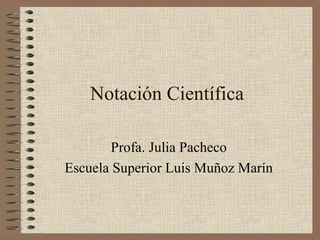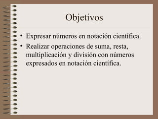 Este documento introduce la notación científica, explicando cómo expresar números grandes o pequeños mediante un coeficiente y un exponente. Detalla cómo escribir números en esta notación, realizar operaciones aritméticas con ellos siguiendo las leyes de los exponentes, y da ejemplos para ilustrar los conceptos.