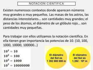 Este documento explica la notación científica, la cual permite escribir números muy grandes o pequeños usando exponentes de 10. En la notación científica, los números se escriben como el producto de un coeficiente y una potencia de 10. El exponente indica cuántos lugares se mueve el punto decimal. Se proveen ejemplos de cómo convertir entre notación decimal y científica, así como realizar operaciones básicas con números en notación científica.