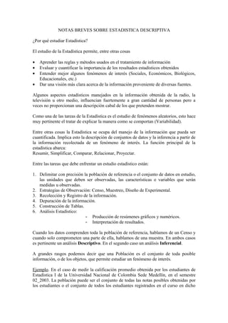Este documento describe los conceptos básicos de la estadística descriptiva, incluyendo por qué es importante estudiar estadística, las definiciones de población, muestra, parámetros, estadísticas, variables, datos cualitativos y cuantitativos, y las diferencias entre estadística descriptiva e inferencial. Divide la estadística en descriptiva e inferencial, y explica que la descriptiva se ocupa de organizar y presentar la información recolectada.