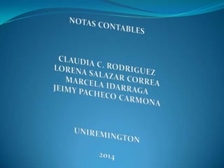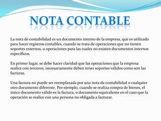 La nota de contabilidad es un documento interno utilizado para registrar operaciones que no tienen soportes externos ni documentos internos específicos, como ajustes por inflación o depreciación. Solo se debe usar una nota de contabilidad cuando no hay facturas u otros documentos válidos, y debe incluir cuentas, valores y saldos debito/crédito. Se recomienda numerarlas consecutivamente para hacer seguimiento y diferenciar tipos de notas por la operación registrada.