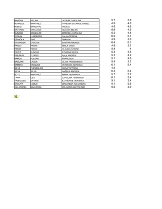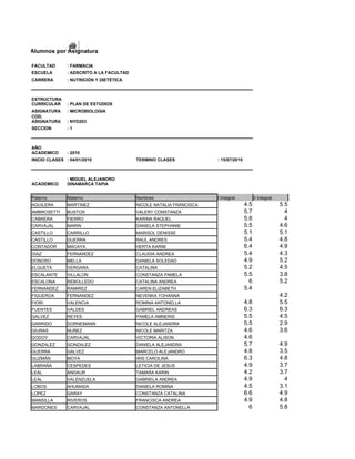 Este documento presenta una lista de alumnos de la asignatura Microbiología de la carrera de Nutrición y Dietética de la Facultad de Farmacia. Incluye los nombres y apellidos de los estudiantes, así como sus calificaciones en las dos evaluaciones parciales del curso. El curso se llevó a cabo durante el año académico 2010 y las clases se realizaron entre el 4 de enero y el 15 de julio.