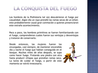 Los hombres prehistóricos descubrieron el fuego posiblemente por casualidad cuando un rayo prendió un árbol seco. Poco a poco aprendieron las ventajas del fuego y trataron de conservarlo, con las mujeres a cargo de mantenerlo encendido. Miles de años después, aprendieron a hacer fuego frotando piedras para producir chispas. Dima, un mamut lanudo de seis meses, fue descubierto congelado en 1977 en Siberia, conservando su pelaje rojizo después de 40,000 años enterrado en el permafrost