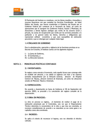 Este documento presenta las notas a los estados financieros del Instituto de Servicios de Salud Pública del Estado de Baja California al 30 de junio de 2011. Explica la creación del Instituto, su personalidad jurídica, patrimonio y órganos de gobierno. También describe las principales políticas contables como inventarios, depreciación, ingresos y egresos. Presenta información sobre fondos de operación, bancos y deudores diversos.
