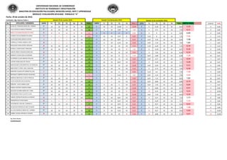 Este documento presenta los resultados de varias evaluaciones realizadas a estudiantes de una maestría. Incluye una tabla con los nombres de los estudiantes, sus calificaciones en diferentes evaluaciones parciales y la nota final de cada uno. También incluye la lista de estudiantes de dos grupos para las próximas fechas de evaluación.