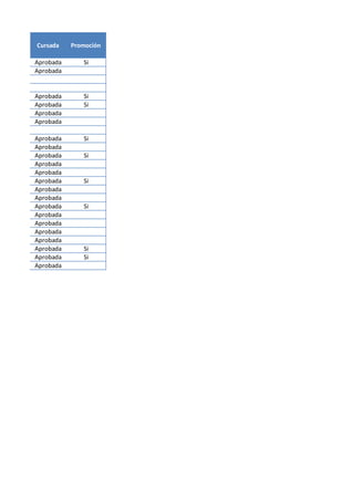 Este documento presenta los resultados de la primera evaluación de un parcial recuperatorio para varios estudiantes. Incluye los nombres de los estudiantes, las notas que recibieron en diferentes categorías evaluadas como trabajo, concepto, y la decisión de si fueron aprobados o no para la cursada y promoción.